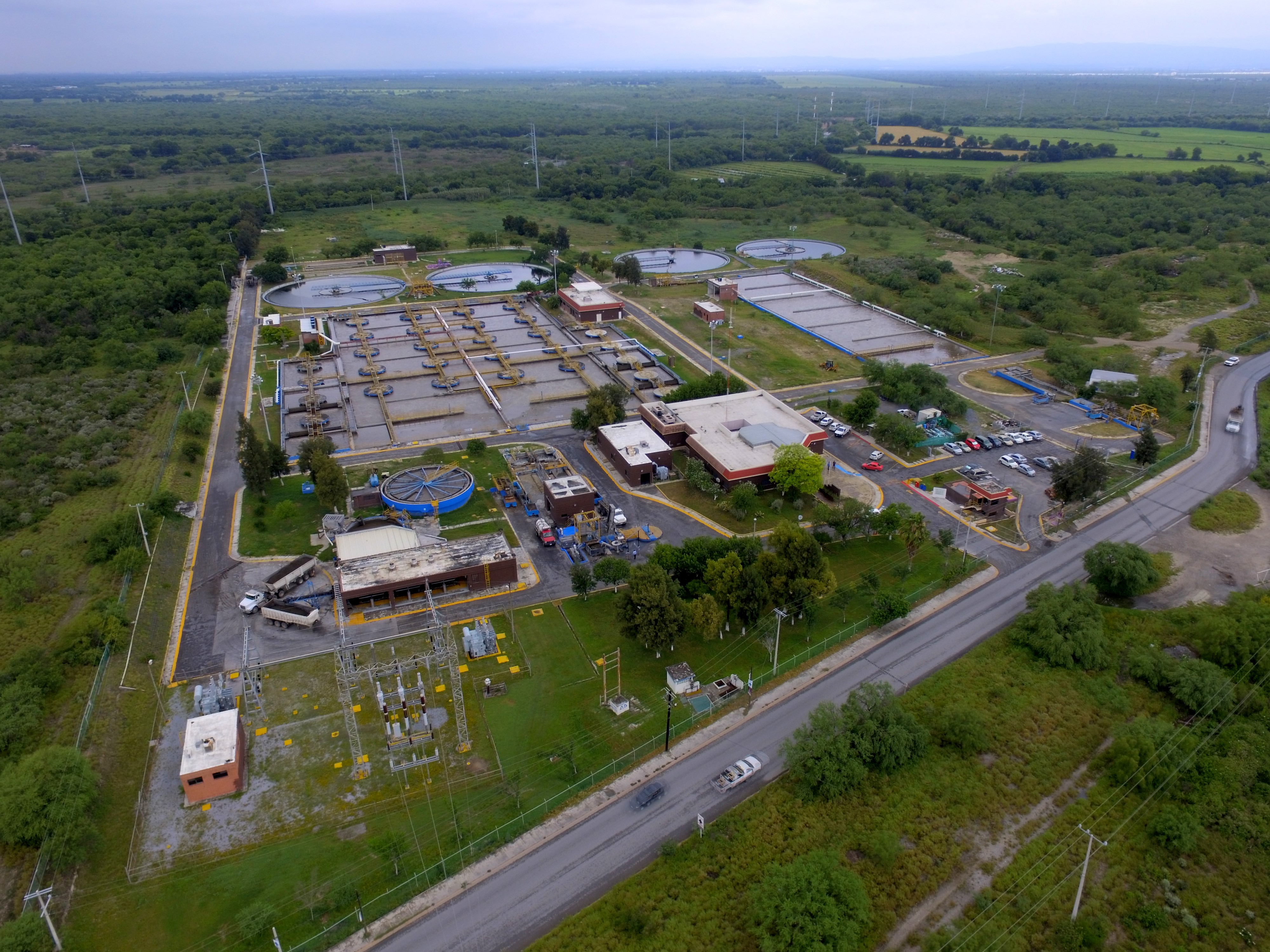 Planta Norte.- Ubicada en la Carretera a Colombia, km 4.5, Col. Las Malvinas, Escobedo, NL. Inicia operaciones en agosto de 1995 con una capacidad de 2,500 L/s, a partir de mayo de 2017 es de 4,000 L/s con la puesta en marcha del tren 6. El tratamiento consiste en un pre-tratamiento con bombeo de influente, rejillas y desarenadores, seguida por sedimentación primaria, para continuar con un proceso secundario de lodos activados y desinfección del efluente. El tren 6 carece de primario.